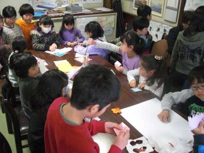 お兄さん、お姉さんに教えてもらいながら折り紙をしている子、