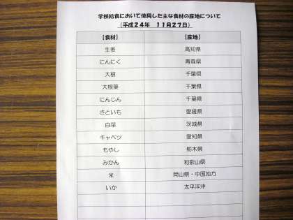 みなさん、今日のうま煮に使われている緑色の葉は何かわかりますか。これは、大根の葉です。大根は、白い根の部分だけでなく、葉の部分もだべることができます。この葉には、少し苦みがありますが、風邪を予防するカロテンやビタミンC、骨をつくるカルシウム、おなかの調子を整える食物繊維など、栄養がたっぷり入っています。ぜひ、残さず食べてください。