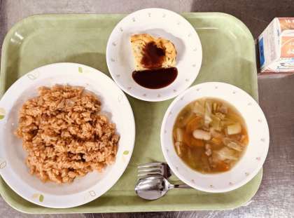 今日は、チキンライス、ジャーマンオムレツ、白いんげん豆のスープ、牛乳です。