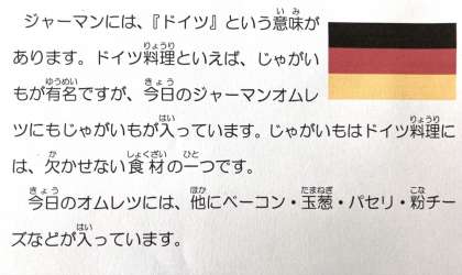 ジャーマンオムレツは、ドイツ風のオムレツと言うか、ジャーマンポテトをオムレツに仕立てたという感じです。玉子とじゃがいもの相性は、悪くないので、ジヤーガいもが、ジャーマにはならないです。