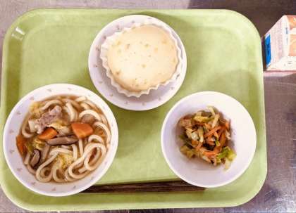 今日は、煮込みうどん、野菜のからし和え、さつま芋蒸しパン、牛乳です。