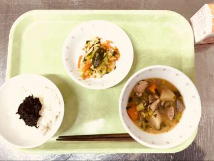 今日は、ご飯、のりのつくだ煮、せたがやそだち大根の味噌煮、野菜のごま酢和え、牛乳です。
