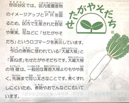 煮物に使われている大根は、「せたがやそだち」の大蔵大根です。生産量が少ないのでスーパーなどには出回らないのですが、JAの直売所で見かけることがあります。人気の商品なので、これがあれば、お店がだいこんざつになるかもしれません。