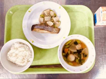 今日は、ご飯、さわらの幽庵焼き、里芋とかぶのそぼろ煮、鶏団子汁、牛乳です。