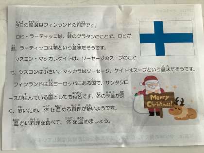 今日の給食は、ミルクパン、ロヒ・ラーティッコ(鮭のグラタン)、シスコン・マッカラケイト(ソーセージのスープ)、牛乳です。このところ寒さも一段と増してきましたので、グラタンやスープは体が温まりとても美味しいです。どちらが美味しいかなと迷いましたが、どうしても心がグラタンし、決められませんでしたので、両方Winner(ウインナー)です。心の声もソーセー(ジ)と言っています。