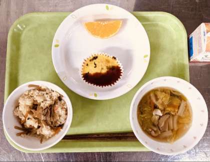 今日は、五目おこわ、卵焼き、白菜汁、果物(夢オレンジ)牛乳です。