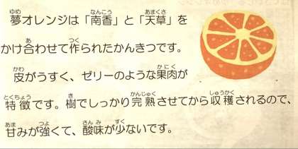 今日の果物は、「夢オレンジ」です。「夢オレンジ」は、みかんの「南香」とオレンジの「天草」の掛け合わせなのタンゴールです。