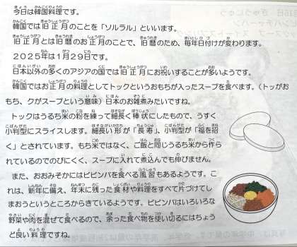 今日は、ビビンバチャーハン、トックスープ、果物(スイートスプリング)牛乳です。