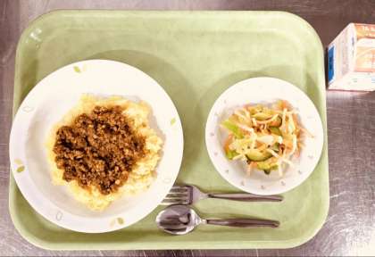 今日は、ドライカレーライス、ポテトチップスサラダ、牛乳です。