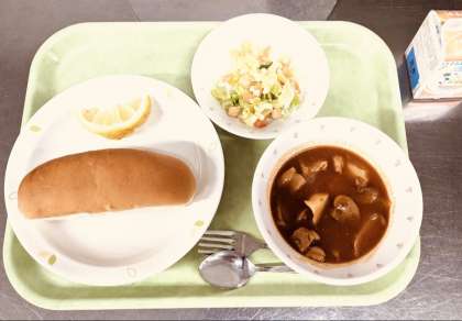 私が給食を食べていたのは30年代から40年代ですが、懐かしい感じがします。でも、牛乳じゃなくて脱脂粉乳でしたし、サラダもシチューも、こんなに美味しくなかったと思います。今日のビーンズサラダは、びーん詰めにして持って帰りたいくらいです。
