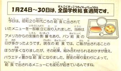 学校給食週間ということで、今日は、昭和20年代ごろのメニューを献立に取り入れたそうです。