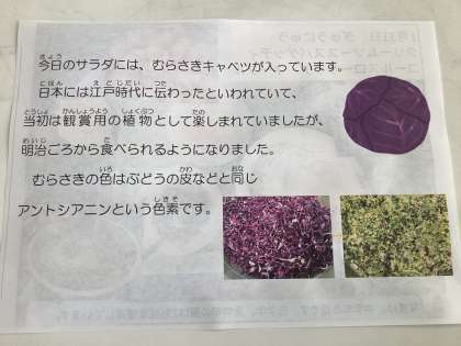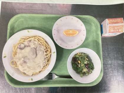 今日の給食は、クリームソーススパゲッティ、コールスローサラダ、果物(ネーブル)、牛乳です。コクのあるクリーム味のスパゲッティとシャキシャキ感いっぱいのコールスローサラダがすごくマッチして美味しかったです。デザートはネーブルでした。ネーブルはヘソという意味だそうで、いつも食べてる温州みかんも美味しいけど平素は食べていないネーブルは甘みと酸味がはっきりしてとても美味しかったです。「へーそう‼︎」と言われそうですが。