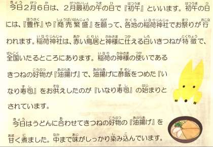 今日は、初午(はつうま)です。牛みたいな字ですが、うまです。稲荷神社にお揚げを供えて豊作を祈ります。