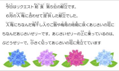 リクエスト給食の第5位です。あじさいゼリーのおかげでしょうか。