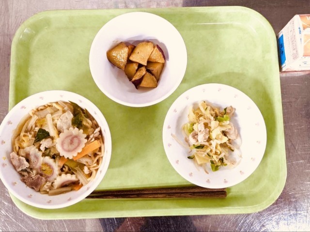 今日は、醤油ラーメン、バンバンジーサラダ、大学芋、牛乳です。