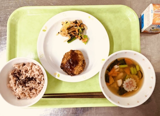 今日は、赤飯、キャベツメンチカツ、朝和え、お祝い汁、牛乳です。