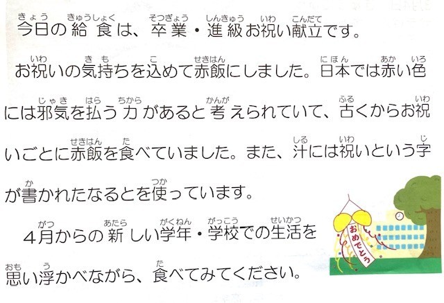 午前中、6年生を送る会だったので、卒業・進級お祝い献立です。