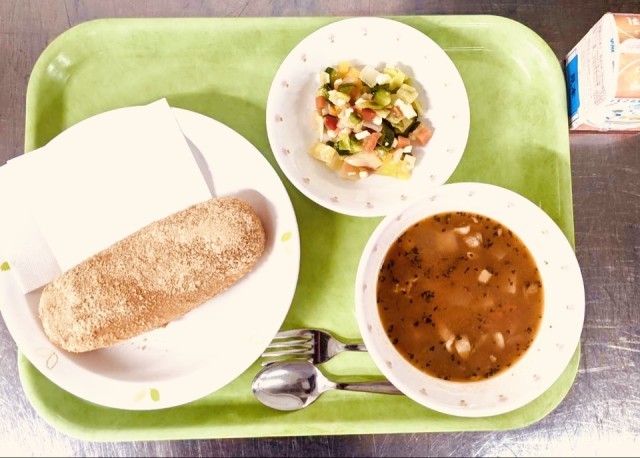 今日は、揚げパン、ミネストローネ、チーズ入りサラダ、牛乳です。