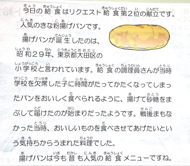昨年度までの揚げパンは、米粉を使ったネジネジのもちもち揚げパンでしたが、今年度の揚げパンは、コッペパンを給食室で揚げているので、昔懐かしい味がします。