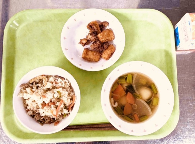 今日は、豚肉とごぼうのご飯、たこといかのから揚げ、芋団子汁、牛乳です。