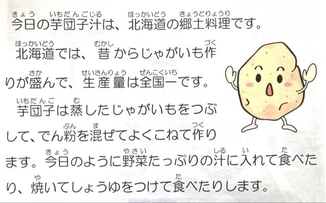 今日の芋団子汁は、山野小学校公認のオフィシャル芋団子汁です。たったひとつ確かなことがあるとするのならば、「きみは美味だ」。