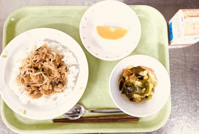 今日は、豚キムチ丼、わかめサラダ、果物(せとか)、牛乳です。