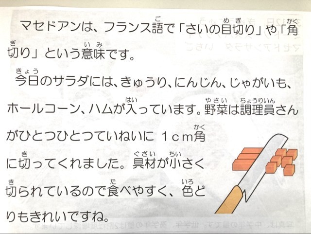 今日は、ミートソーススパゲッティ、マセドアンサラダ、果物(いちご)、牛乳です。