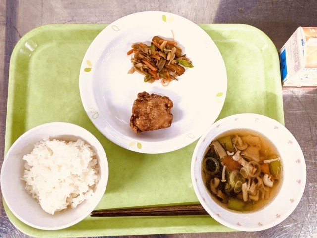 今日は、ご飯、鶏のから揚げ、切干大根の煮付け、牛乳です。
