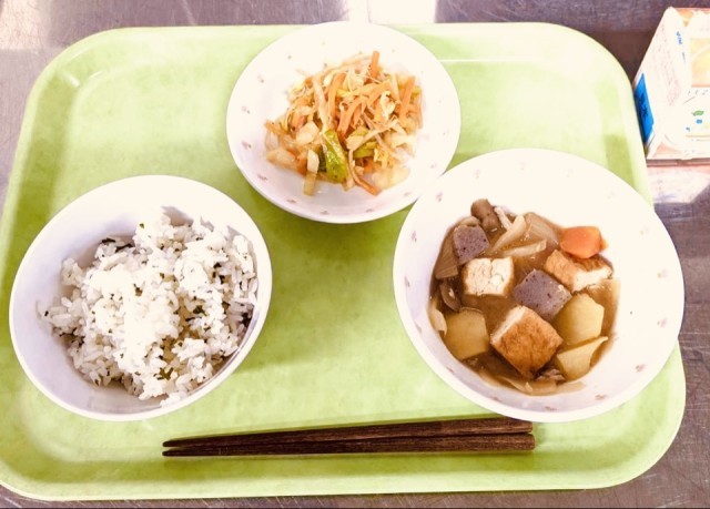 今日は、わかめご飯、五目味噌煮、じゃこの和風サラダ、牛乳です。