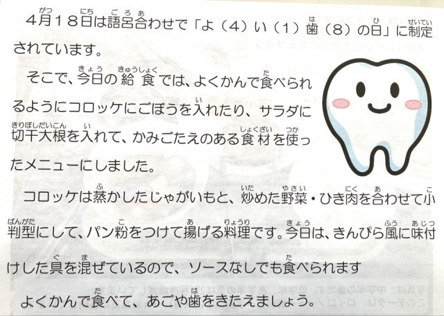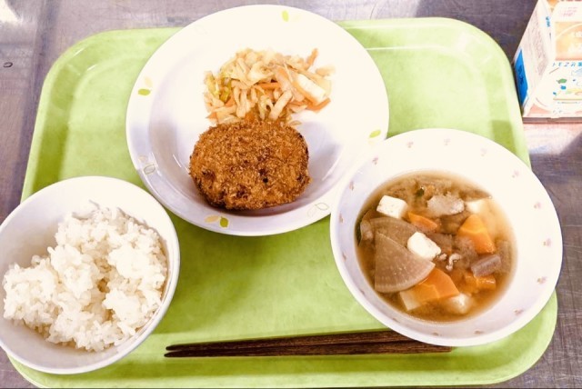 今日は、ご飯、きんぴらコロッケ、切干大根のカミカミサラダ、豚汁、牛乳です。