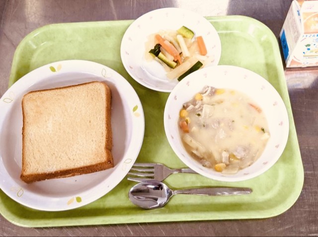 今日は、バニラトースト、コーンシチュー、スティックサラダ、牛乳です。