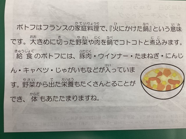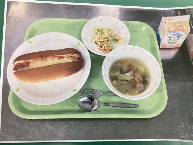 今日は、ビーンズチーズドッグ、ツナサラダ、ポトフ、牛乳です。