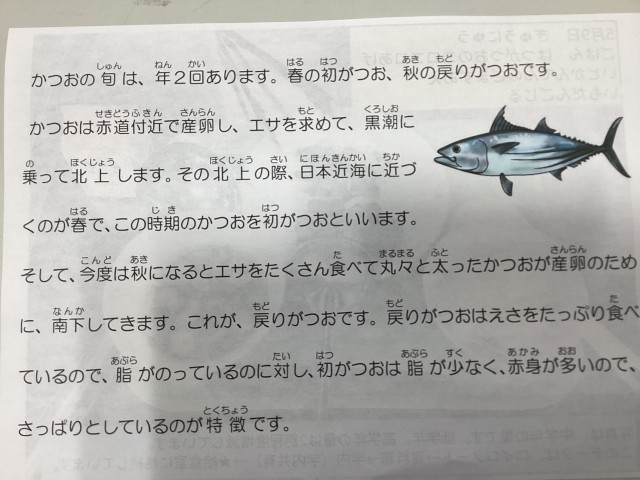 今日は、初ガツオのコロコロ揚げ、糸寒天のごま酢和え、芋団子汁、ご飯、牛乳です。