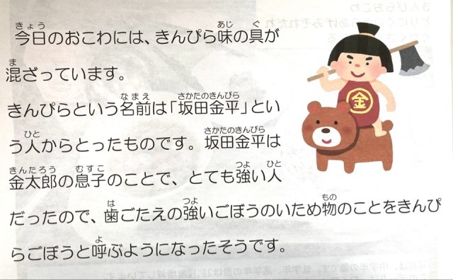 今日は、きんぴらおこわ、鶏肉のから揚げみぞれだれ、具だくさん味噌汁、牛乳です。