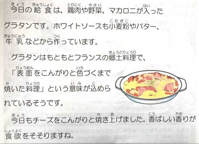 今日は、ミルクパン、チキングラタン、ひよこ豆入り野菜スープ、牛乳です。