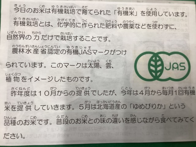 今日は、鰆の照り焼き、揚げじゃがいもとれんこんのきんぴら、えのきの味噌汁、ご飯(有機米)、牛乳です。