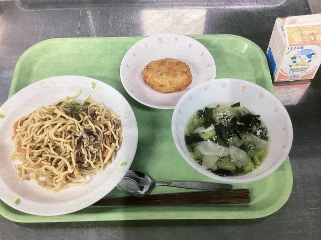 今日は、うま塩焼きそば、もちもちポテト、ワンタンスープ、牛乳です。