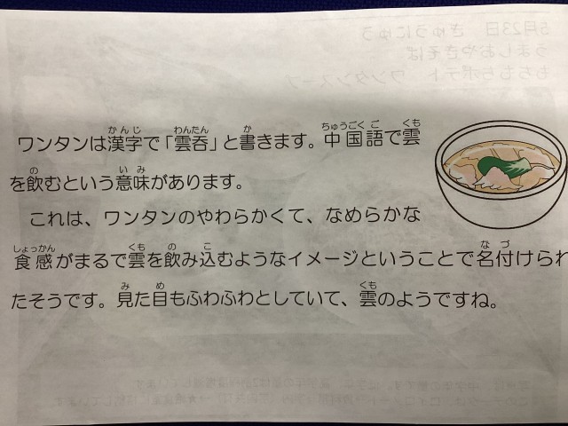 ワンタンスープには、野菜がたっぷり、やさしい味です。