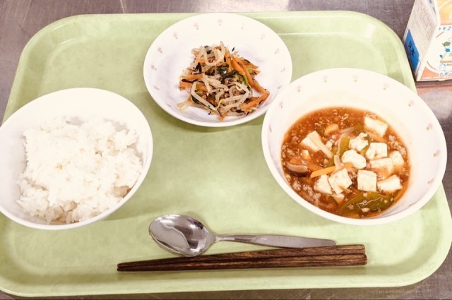 今日は、ご飯、西湖豆腐(しーほーどうふ)、ひじきのナムル、牛乳です。