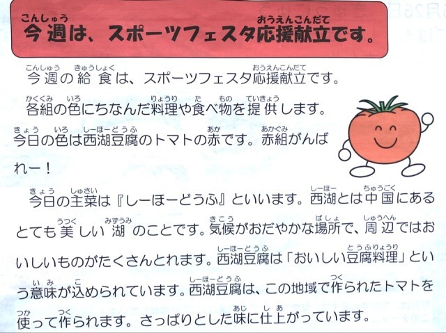 今週の土曜日がスポーツフェスタということで、今週の給食はスポーツフェスタ応援献立です。フェスタカラーの6色のうち・最初の今日は「赤」です。