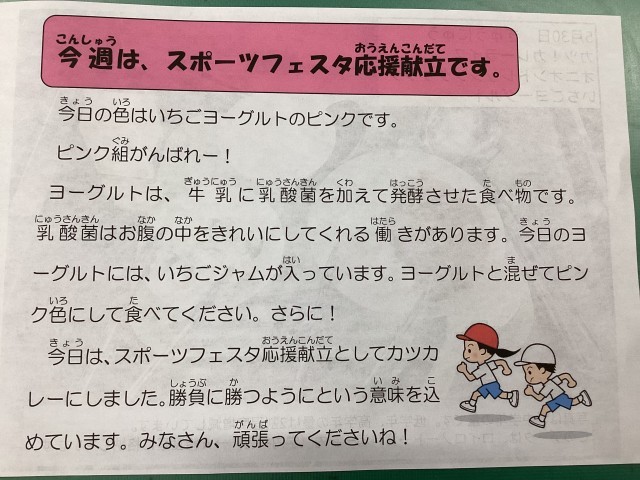 スポーツフェスタ応援献立の最終日、今日はピンク色です。