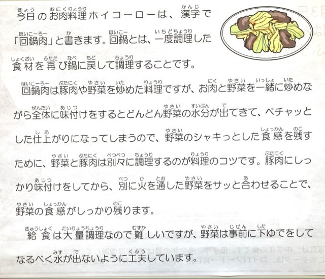 今日は、ご飯、回鍋肉(ホイコーロー)、華風もやし、牛乳です。