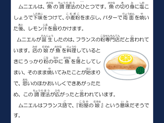 今日の給食は、ご飯、白身魚のムニエル、サウピカンサラダ、ミネストローネです。