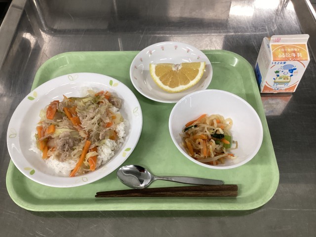 今日は、豚肉のうま煮丼、大根ともやしのピリ辛和え、河内晩柑、牛乳です。