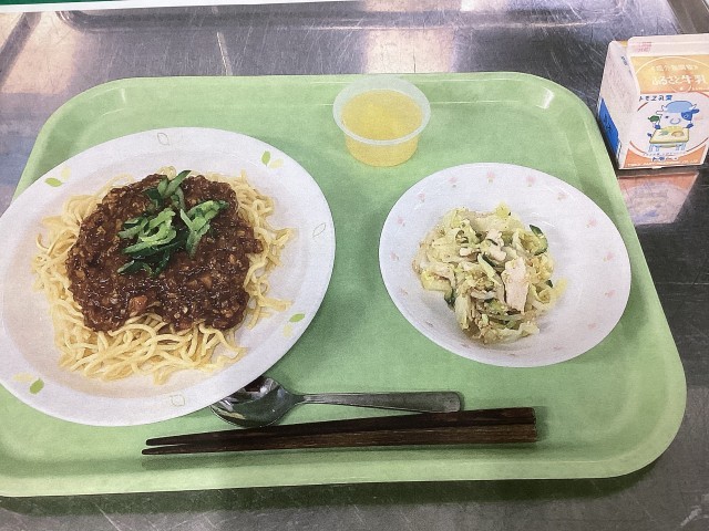 今日は、ジャージャー麺、バンバンジーサラダ、りんごゼリー、牛乳です。