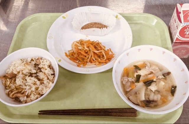 今日は、シシジューシー(混ぜご飯)、にんじんしりしり、イナムドゥチ(汁)、ちんすこう、牛乳です。
