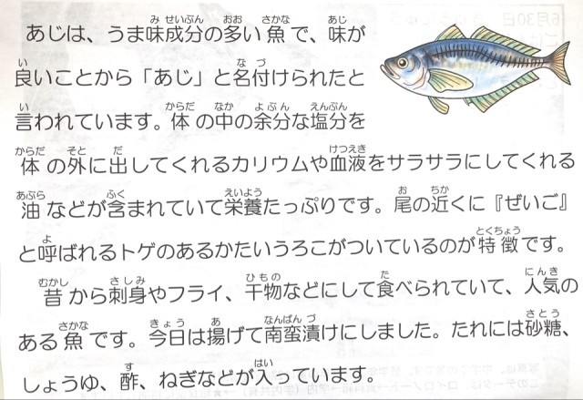 あじの南蛮漬けは、砂糖、醤油、酢で味付けしたたれが、あじの味を更においしくしてくれています。おいしい給食番付けの中でも、上位何番目かに入る美味しさです。