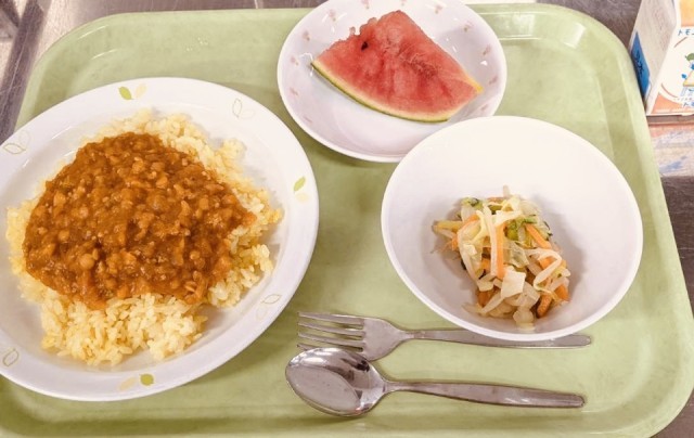 今日は、レンズ豆入りドライカレー、野菜の味噌ドレかけ、果物(すいか)、牛乳です。