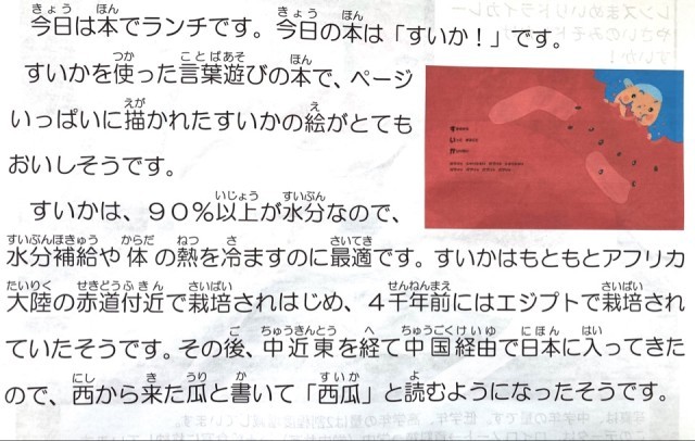 ~本でランチ~です。今日の絵本は、石津ちひろさん(文)村上康成さん(絵)の、「すいか」です。「す」「い」「か」の三文字を使ったアクロスティックの言葉遊びが、とても面白い本です。伊豆高原にあった村上康成さんの美術館は最近、閉館してしまいましたよね。一度も行けなかったのが残念です。