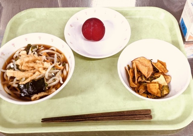 今日は、冷やしうどん、ゴーヤ入り野菜チップス、果物(プラム)、牛乳です。